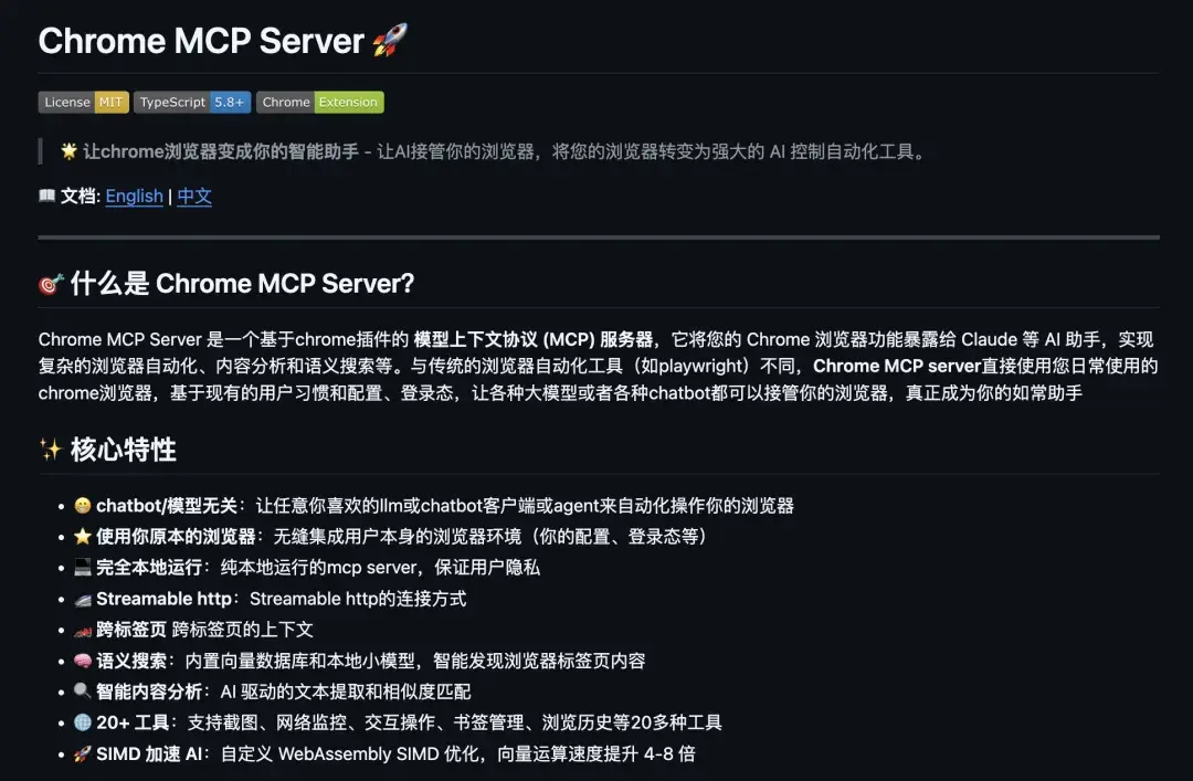 让 AI 直接调用你本地的 Chrome 浏览器完成网页操作、截图、书签管理与内容搜索,适合自动化和信息整理。